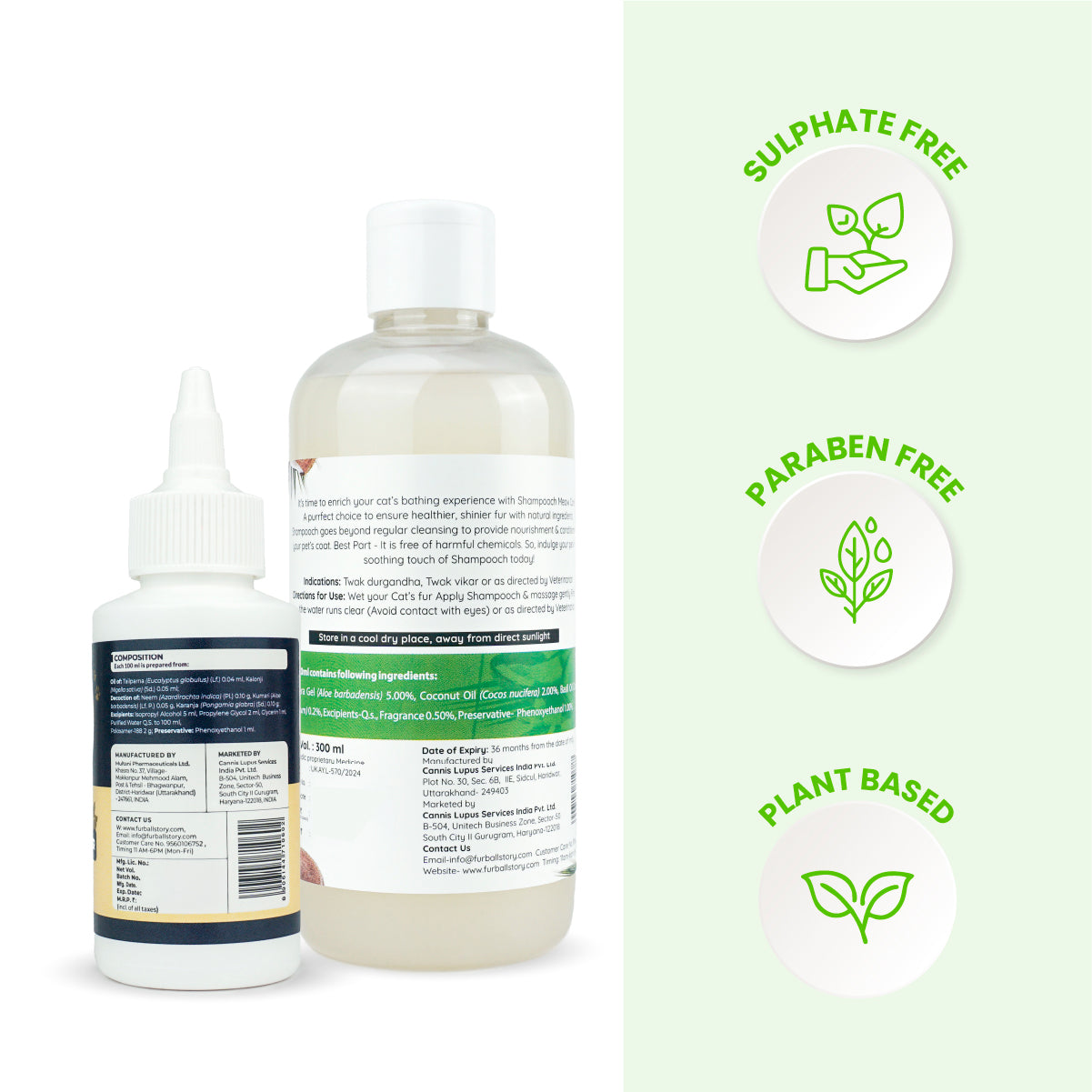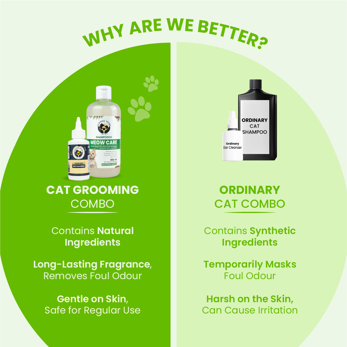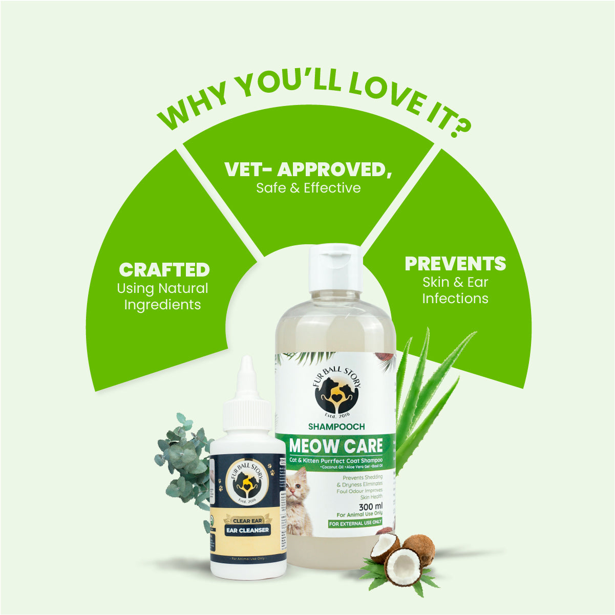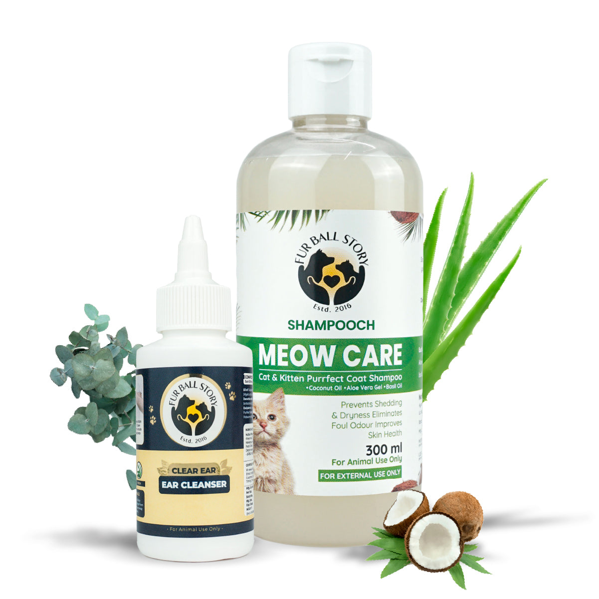 The combo pack includes Meow Care Shampoo for gentle cleaning and Clear Ear, a safe ear cleanser for cats.