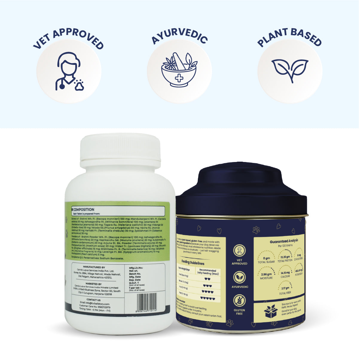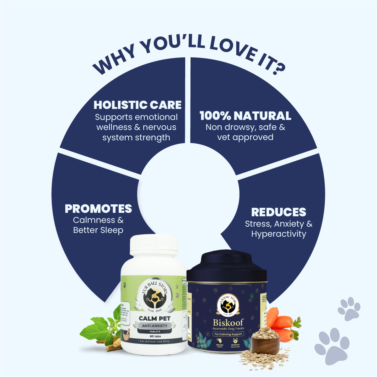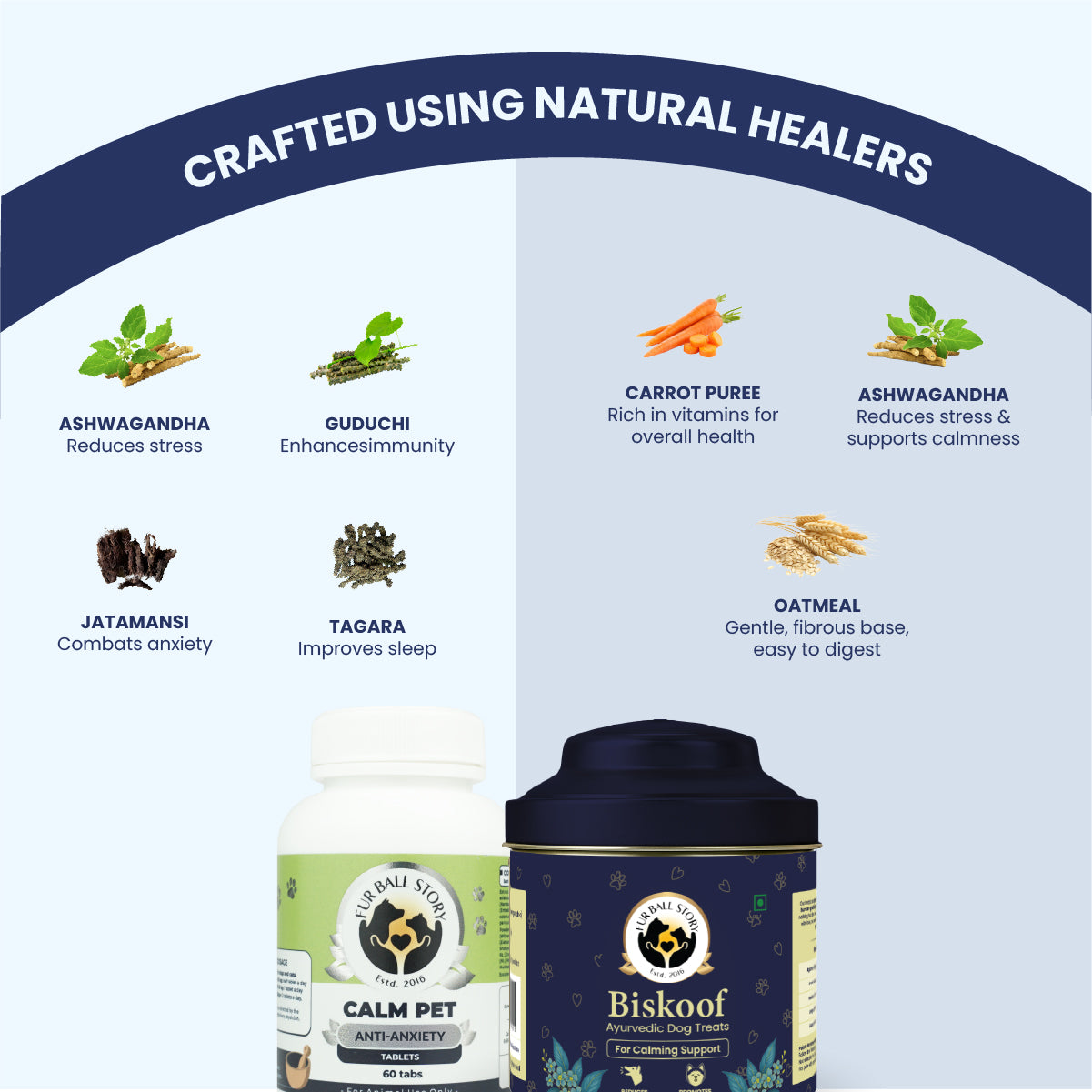 The combo pack includes Biskoof Calming Support for stress relief and Calm Pet Tablets to help keep your dog relaxed and happy.