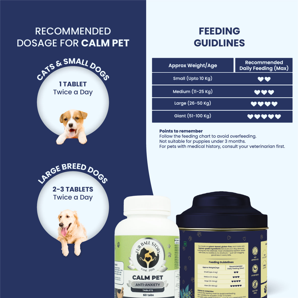 Give Biskoof Calming Support as directed to manage stress and anxiety. Administer Calm Pet Tablets during stressful situations or as recommended by your vet.