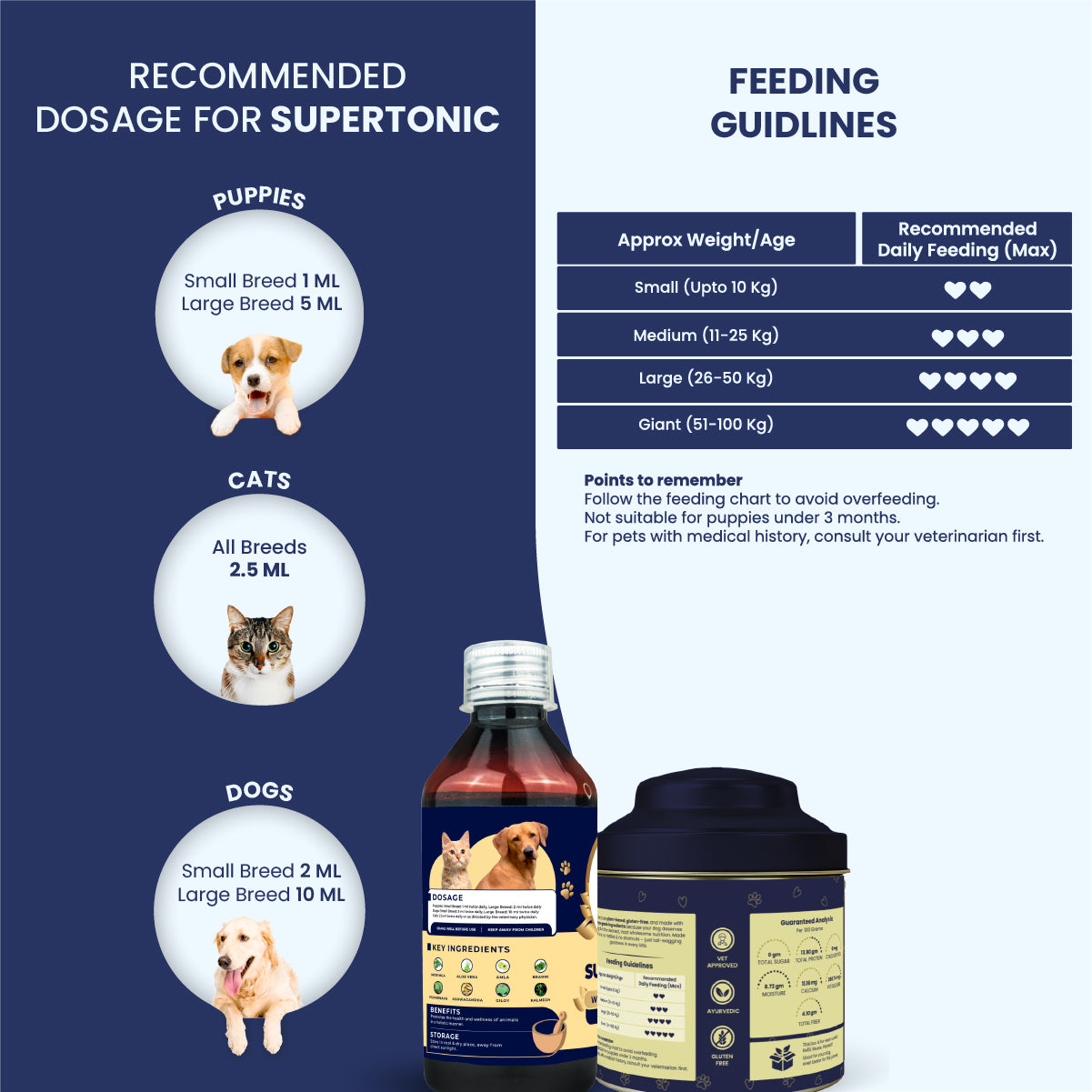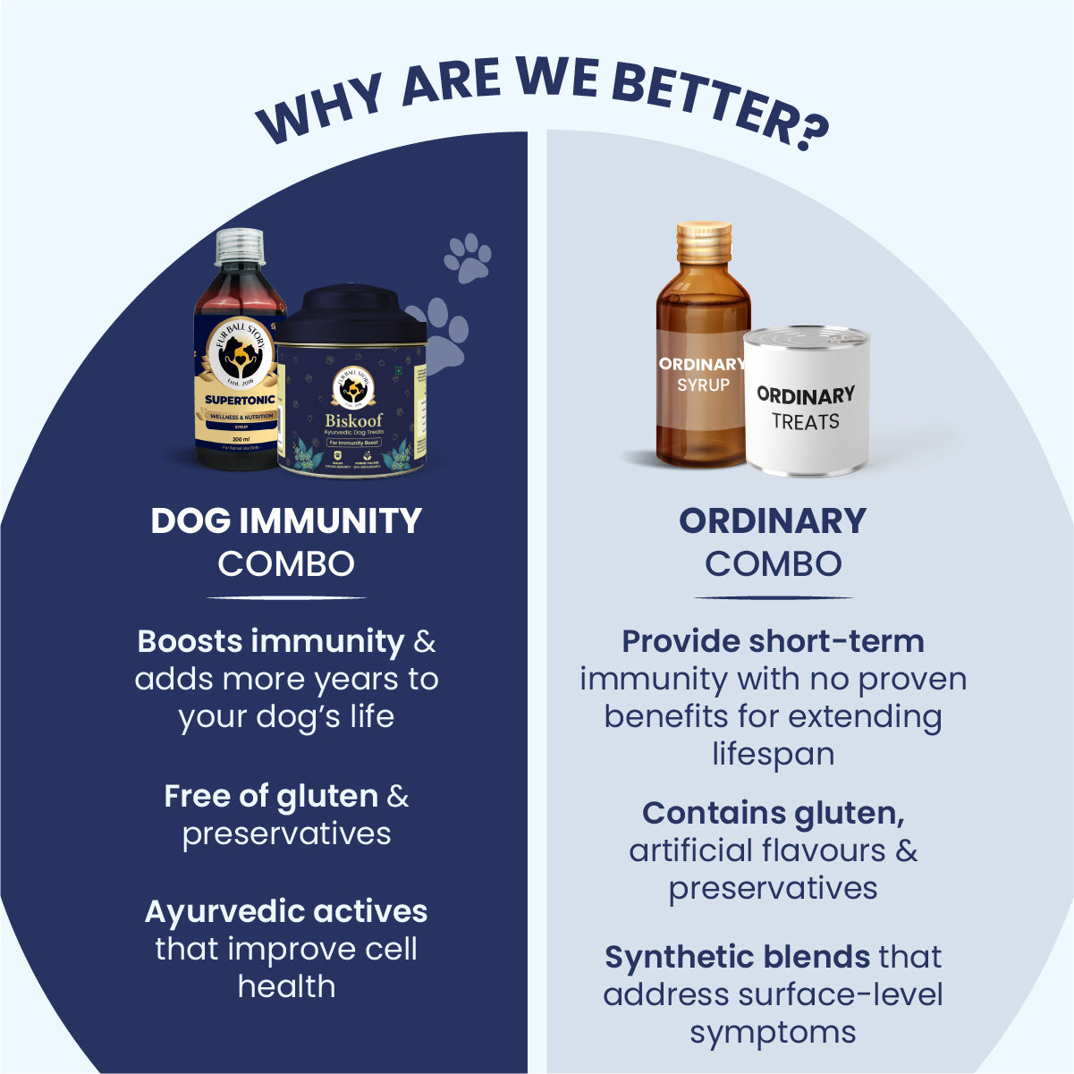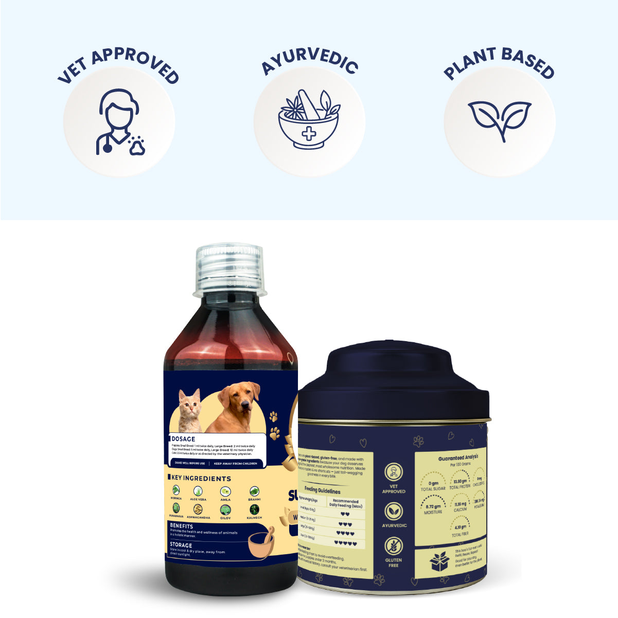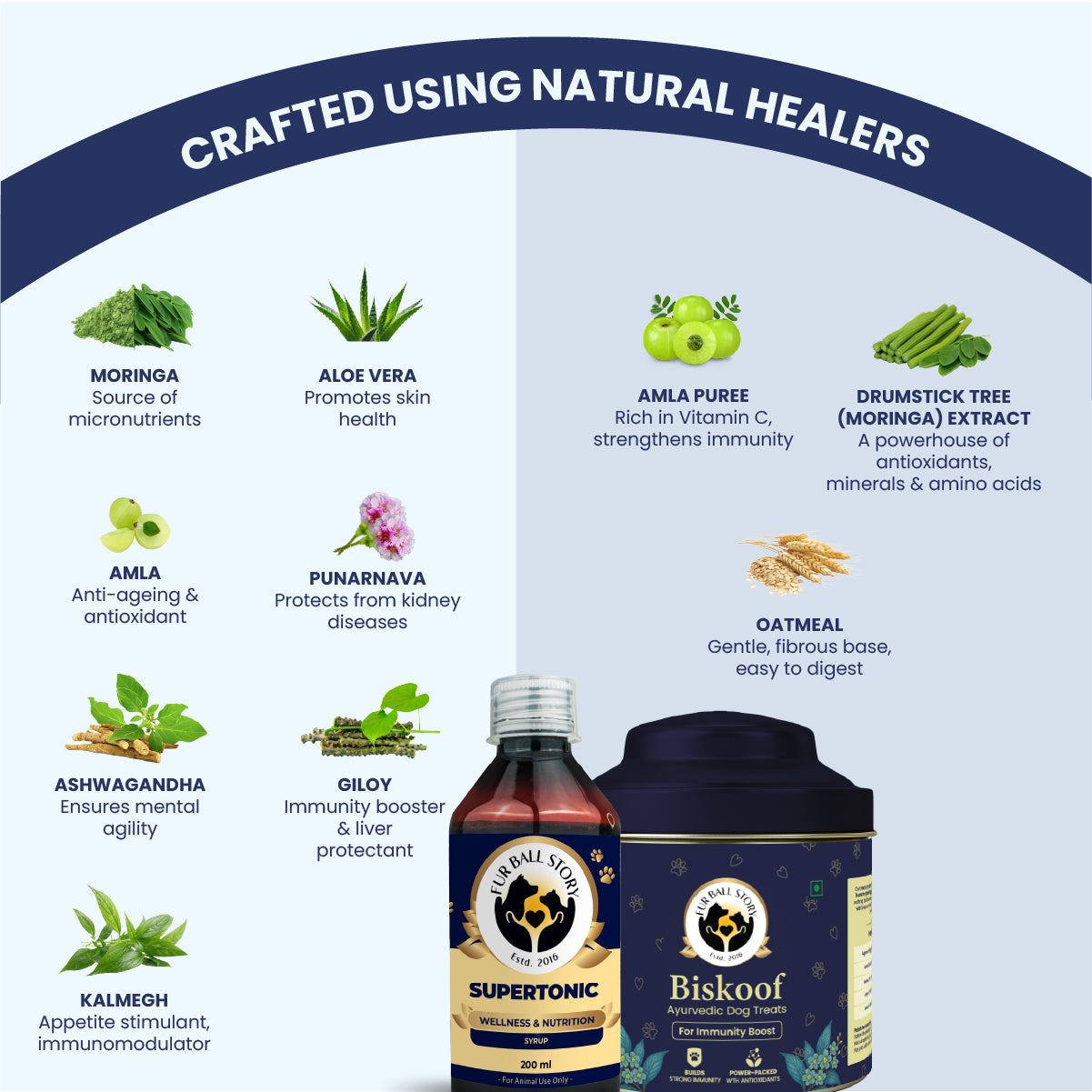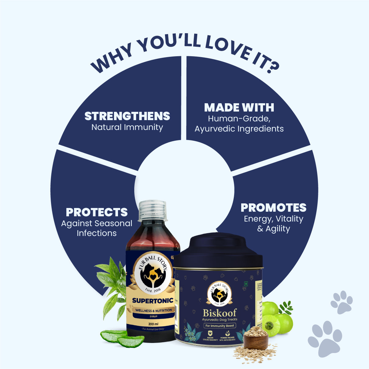 The combo pack includes Biskoof Immunity Support to boost your dog’s natural defenses and Supertonic Syrup for overall vitality and wellness.