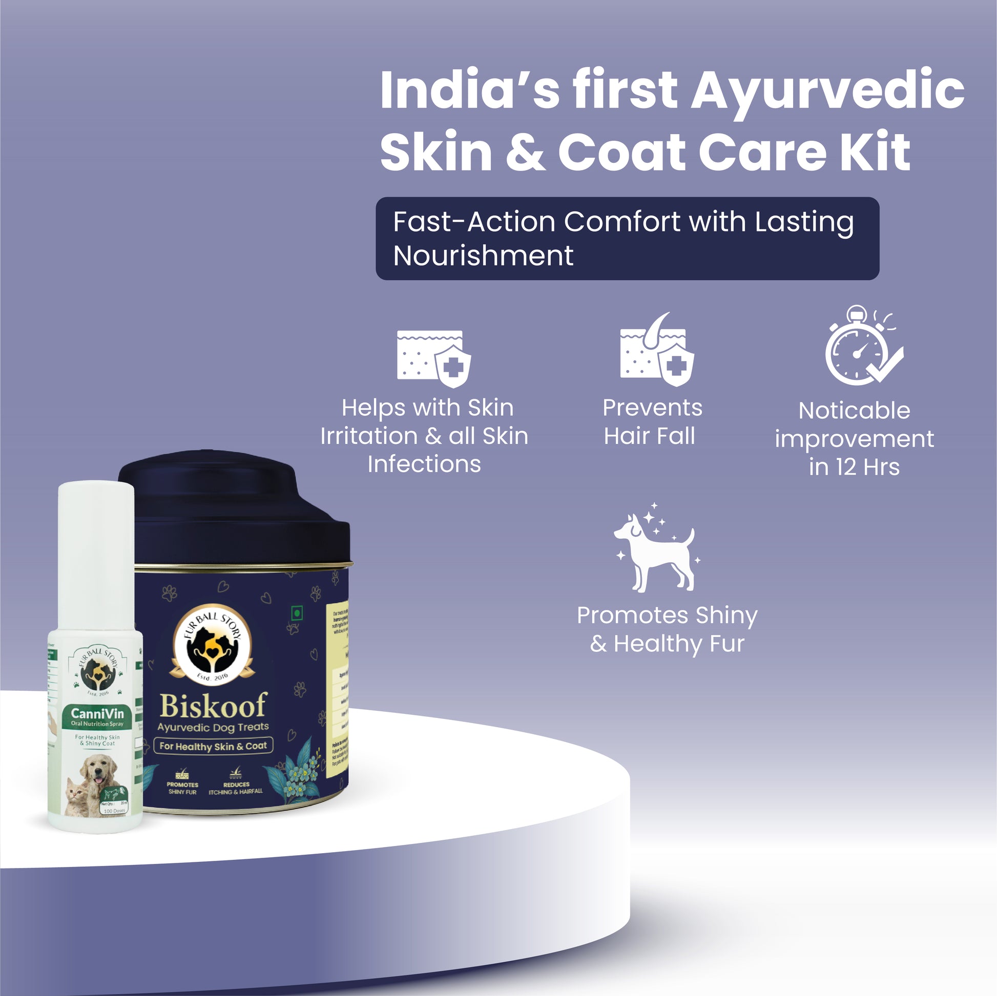The combo pack includes Biskoof Healthy Skin for skin and coat support and CanniVin Oral Spray for healthy bones and teeth.