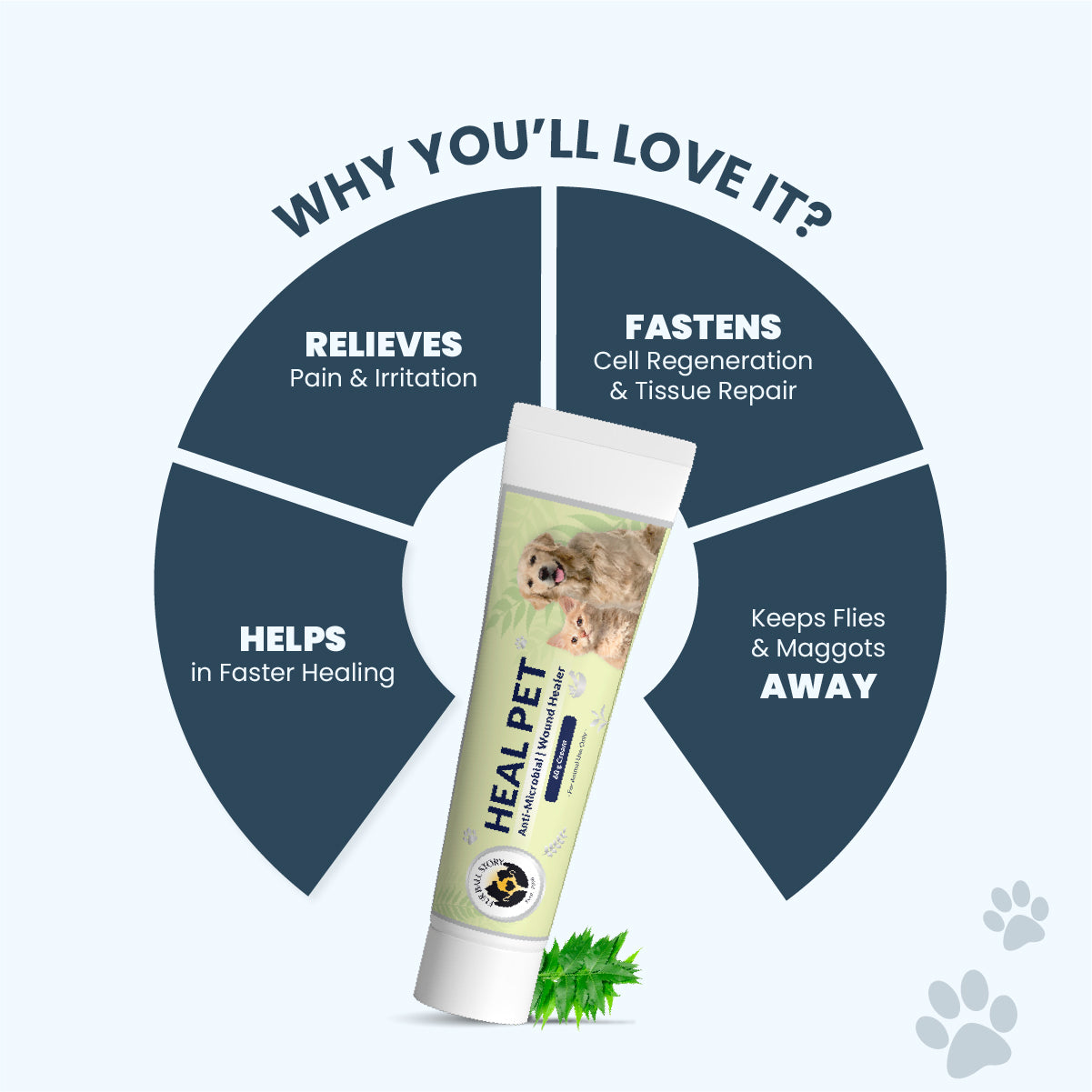 Heal Pet is an Ayurvedic wound-healing cream for pets that addresses the continuous danger of microbial attacks on wounds and open cuts. It facilitates the healing process of wounds, burns and minor injuries. Heal Pet offers rapid pain relief to your pet with anti-inflammatory, antiseptic, anti-microbial, antifungal and astringent properties. It helps to reduce pain, irritation, and itching, thereby accelerating the wound-healing process.