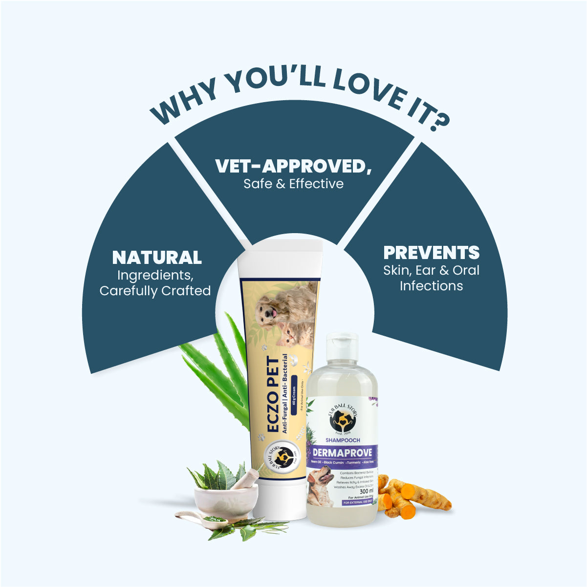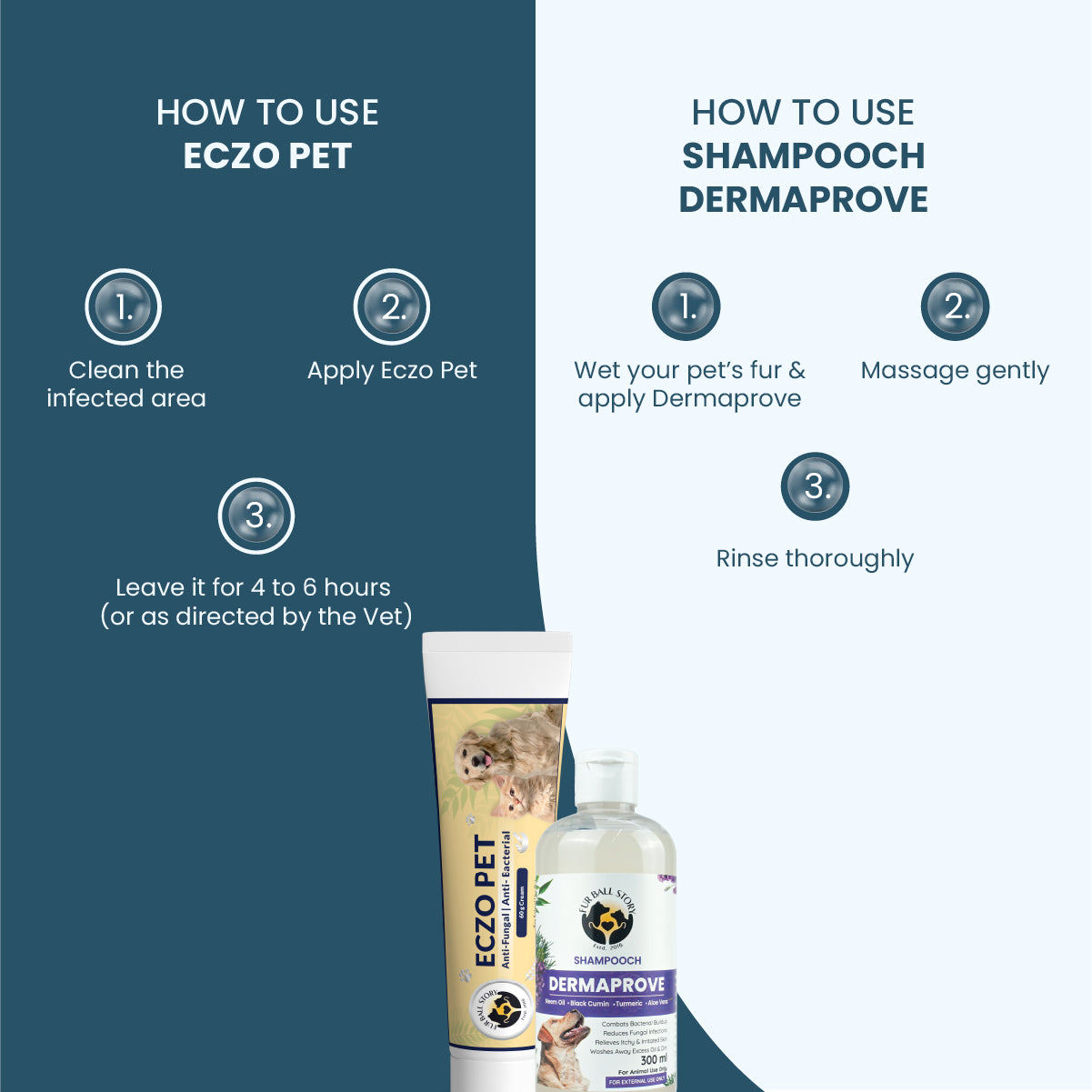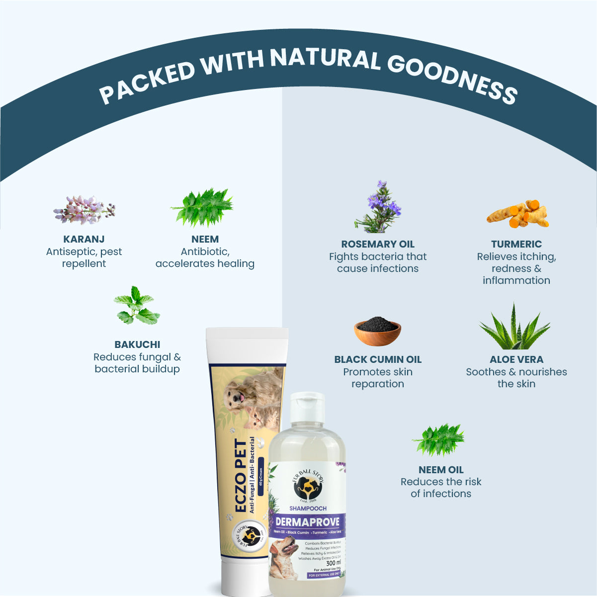 The combo pack includes Dermaprove Shampoo for soothing irritated skin and Eczo Pet, an Ayurvedic solution for managing skin infections.