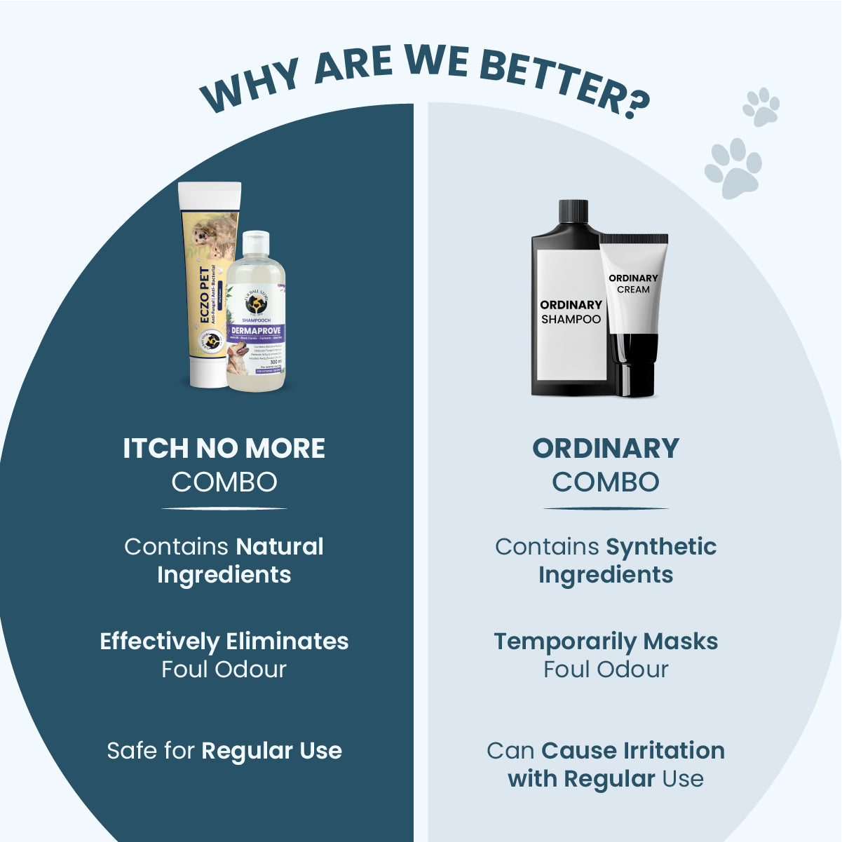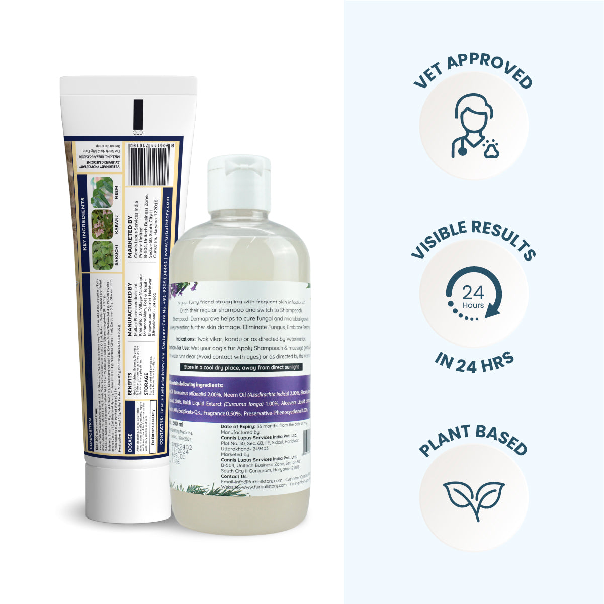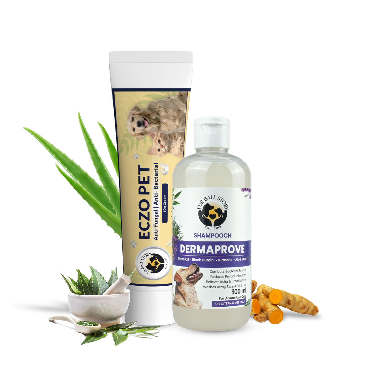 The combo pack includes Dermaprove Shampoo for soothing irritated skin and Eczo Pet, an Ayurvedic solution for managing skin infections.