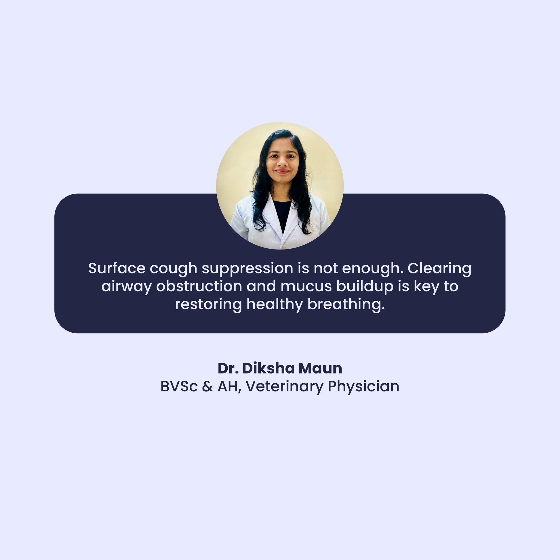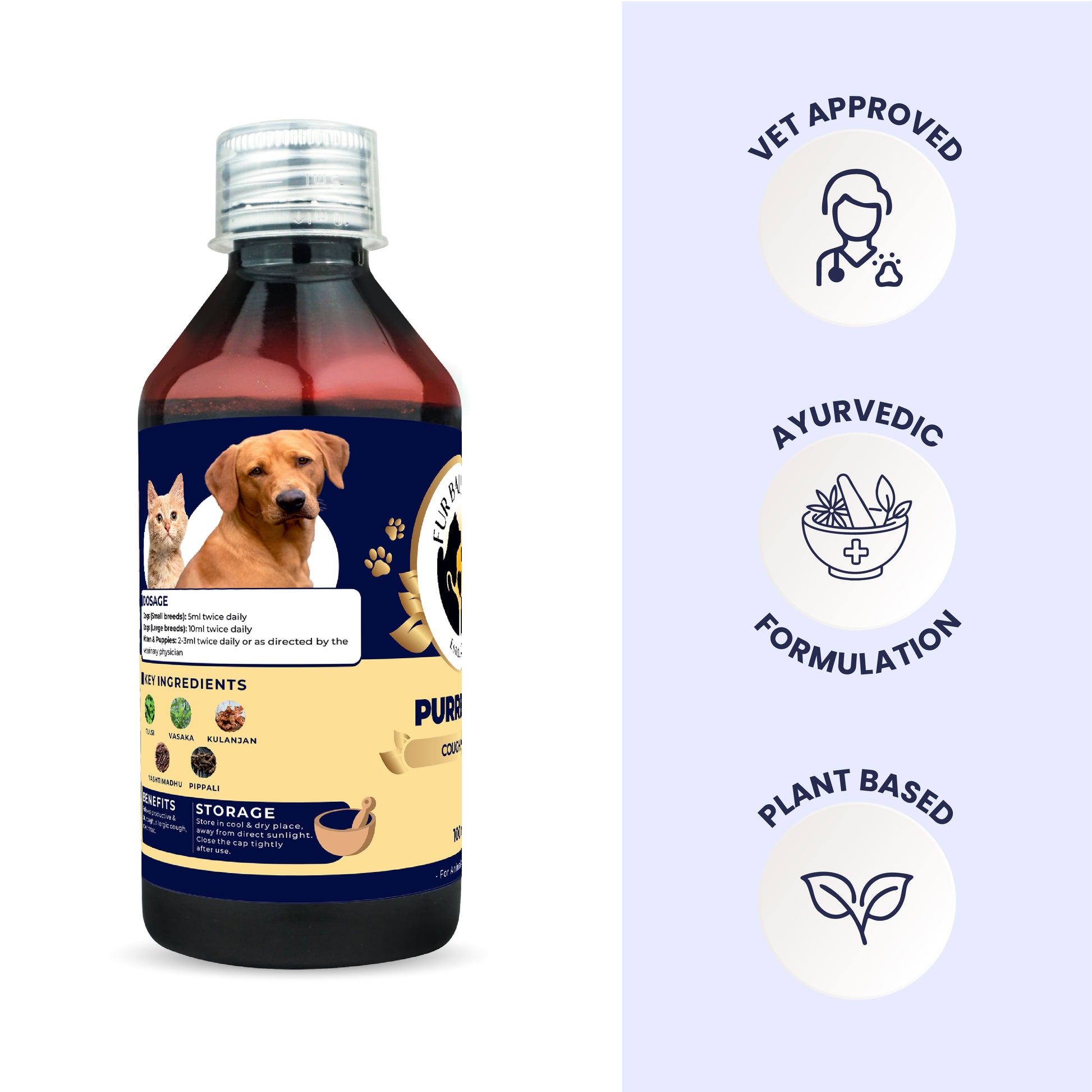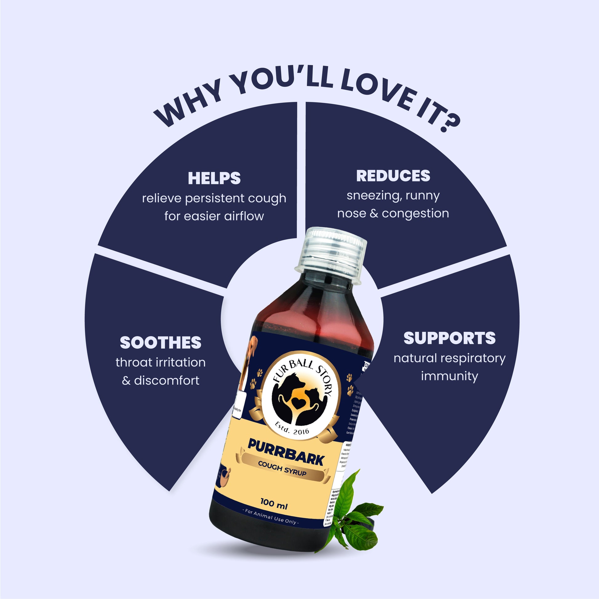 PurrBark syrup is very effective for such pets. It helps relieve persistent cough by breaking down thick mucus that blocks the airway. Its ayurvedic actives reduce inflammation and support healthy airflow, leading to smoother breathing and improved comfort with regular use.