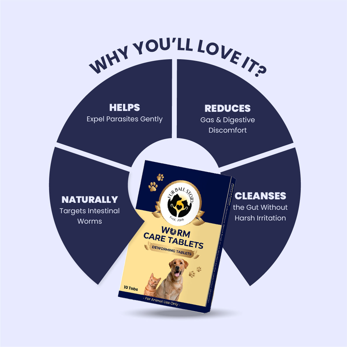 Worm Care is a natural deworming tablet formulated to help eliminate intestinal parasitic worms in dogs using herbal anthelmintic actives. It targets nematode infestations while supporting mild laxative action to help expel parasites naturally. At the same time, it eases gas, bloating, and digestive discomfort commonly associated with worm load, supporting gut balance during short deworming cycles.
